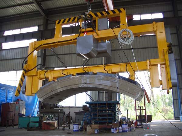 國內自主研制的隧道混凝土管片吸吊翻轉機,真空吸吊,電動翻轉,水平吸吊能力10噸,垂直吸吊能力5噸。用于管片生產企業的管片脫模、搬運及隧道管片的搬運吊裝。