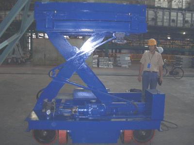 該設備應用于攀鋼1250熱鍍鋅生產線連退火爐底蓋的維修更換。設備載重量3000公斤,可在負載狀態下縱橫兩個方向電動行走,起升高度2209,工作臺可前后左右電動液壓微調150mm。