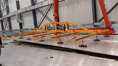 該應用實例吸吊重量2000Kg,15只吸盤頭,每只直徑260mm,吸吊鋼板13m*6m,每只吸盤頭均裝有截止閥,可根據需要關閉部分吸盤頭,吸吊不同尺寸的板材;
