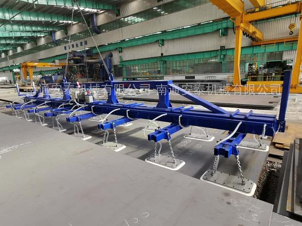 應用實例吸吊重量15噸,吸吊板長度14m,寬度2.5-3m,厚度8-45mm;16只長方形吸盤頭,每只850mm*450mm;